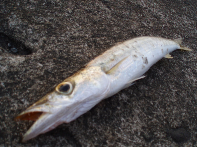 ■■■ 6月28日 AM3:30 そろそろ河口にイワシが入っているんでないかと行って来ました。イワシがはいれば巨アジ釣りが楽しめる。駐車場で仕度していると車が止まり私に声を掛けてくれた。あっY間さん久しぶりです。先に行きますわと波止を歩く。先端角には一人のアングラーがいた正面からキャスト。18gのジグで狙う。アジがいれば即当たるのだが反応なし。9cmミノーにチェンジ。グン!ヒット!なんやろ?カマスでした。掴もうとしたらポトッあっ落ちた