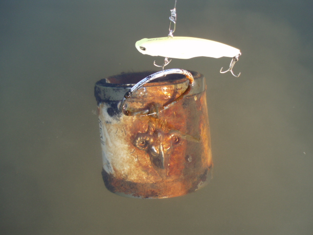 その後反応なく夜明けワームでチヌねらってみました。クンクンなにか当たったがそれきり25gのジグでヒラメでもと狙うとヒット!グングンふっばれました。ベイトの気配なしあかんと見切りをつけ川へ移動。河口近くでウェーディングゥー!ブレイクをバイブレーションで狙う。グン!来た!ぐーんぐーんとなんか重い引き?でもなんかおかしい上がってきたのははずかしいバ・ケ・ツ猛牛マークの笑てまうわわっかにフックかかってるし~