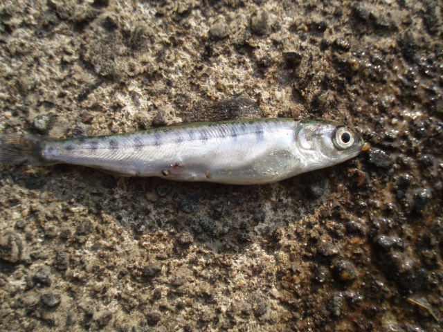 高屋橋上流右岸へ向かう。1人のアングラーがいた。下流はあいかわらず満員御礼!濁りもたいしたことなく良さそう。水位も上がっているのでルアーはスミスチェリーブラッドMDをチョイス。一通り探りましたが反応なし。足元に弱った魚がいる手ですくってみた。サケ?ヤマメ?トラウト系の顔してます。