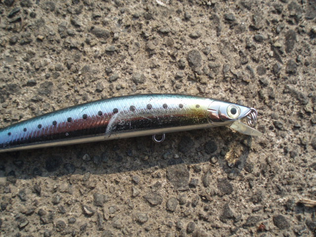 海に下る前に傷ついたようです。ルアーチェンジする薄い濁りの中でフラッシングさせる為にいつものオイカワカラーをやめイワシカラーをキャストする。数投目コンと当たった。反射的に合わせる。グングン!来た!!トルクのある引き。ローリングしている。ドラグもジィジィーでる。でかいかも?引きに耐えてるだけでリールが巻けない。サクラマスが水面に上がってバシャとした瞬間ルアーが空中を飛んだああ~ばれた~