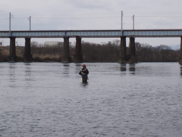 ■■■ 3月4日 AM8:45 午前だけ川へ出掛けてきました。そろそろえち鉄が良いのではと思いえち鉄下流左岸へ護岸には2人いました。昨日の雨で、少し濁り気味だった。もう少しクリアだといいなと思いながら釣り下った。途中愛知から来た方としばし話をしました。越前FCのHPに魚持って写りたいんですよと言ってました。頑張ってくださいと声を掛け私は移動。(この後この人がサクラをキャッチするとはしらず)九頭竜橋右岸へ川辺に来たとき道路に見慣れた車が止まった。あっ石○さん!こないだキャッチしたとこにいたそうですがあかんので移動してきたそうです。しばらく橋下でキャストするが冷たい風がぴゅーぴゅーと吹きまくり寒い