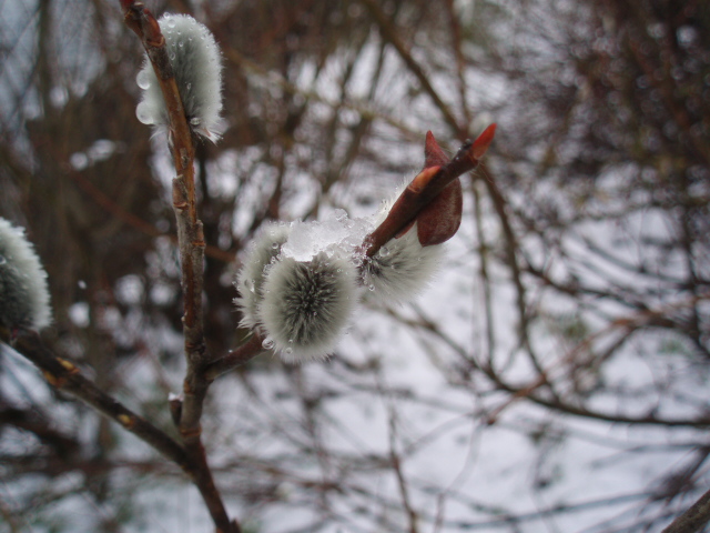 体ぬくめる為釣り下る。猫柳の綿毛も雪かぶって寒そうです。