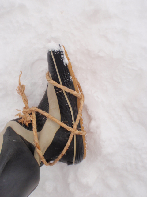 長靴に荒縄巻いて滑り止めをし、いざ屋根へ!
