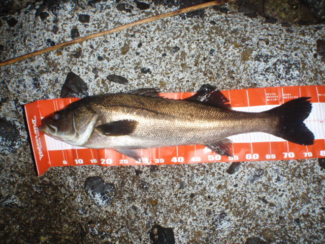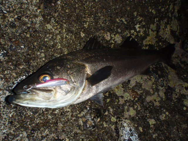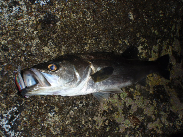 もう一度、クルーズシンキングミノーへ戻し、1投目、ガツン!と強い当たり!小さいが元気いっぱいの50cmシーバスをキャッチ!