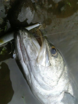 ■■■ 6月6日 AM7:45 夜勤が早く終わればショアジギに行く予定だったが終わったのはもう潮どまり近く雨後なんで川へ行くことにした。ポイントへ向かう。夜中にきつく降っていたので川も薄濁りでいい感じ。ルアーをキャストする何回もルアーローテーションする。初めてS字系のビッグルアーを引いてみたがうーんなかなか良いではないの!ここでガバッと