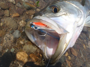 流れとラインが一直線になりちょんちょんと誘うとズバーン!!水面炸裂!!ヒット!