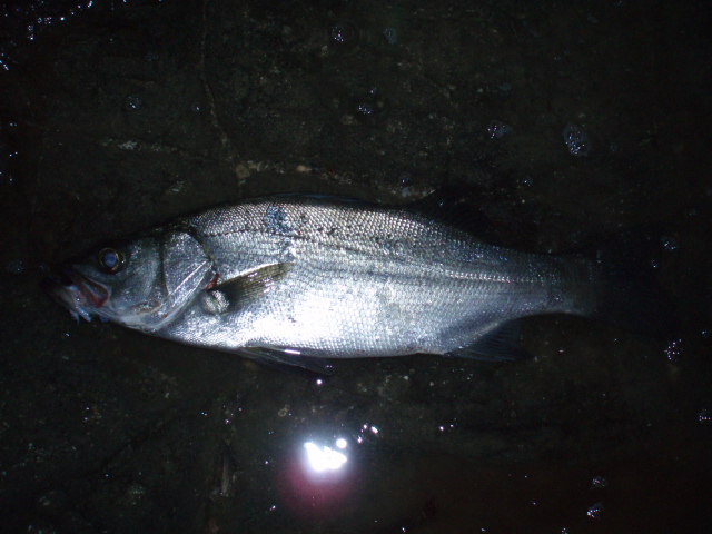 9月23日 AM5:30 昨日磯シーバスを狙ったが、小ヒラマサのチェイスで終わってしまった。O君を誘い再度狙いに行くことに、昨日より波が落ちてきているので、磯際をタイトに攻める。しばらくするとO君のロッドが曲がった。 小型ながらシーバスをキャッチ。