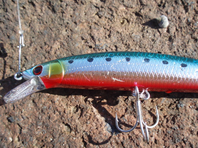 を走らせた。波の入りが逆の為、サラシこそないが、濁りはある。ルアーはただいまエースルアーであるジャクソンアスリートスリム、日中なのでイワシカラーをセレクト。シャロー側から扇状にキャストを繰り返すが反応がない。何かがたりないのか?そこでリトリーブスピードを変えた。ハイスピードでリトリーブした。ガツン