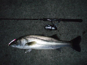 雨で川の流れが出るだろうという理由だ。川に来ると一台の車が止まっていた。O君来てるんや。声を掛けずにO君の下手に入った。濁りはないが流れのヨレが暗いながらも確認出来た。ショアラインシャイナーR40をキャスト。数投目足元で、ひったくるようにバイト。派手なジャンプをしなかなかの引きをみせた。