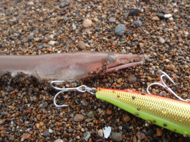 イカツイ顔してるし、すごい力で砂に潜るし、これが半端なく力が強くてルアーが砂の中に持っていかれそうでした。