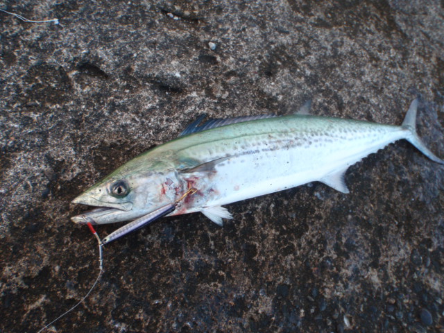 南風がかなりきつくどこへキャストしてるのか、ルアーの位置さえもつかめない状況に嫌気がさした私はO君と別れ風を避けられる場所へと移動し青物を狙いに行きました。