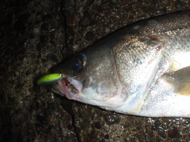 あんまり引かないのでサイズは良くわからなかったのですが足元まで来るとグイグイと力強い引きを見せ久々のシーバスキャッチ
