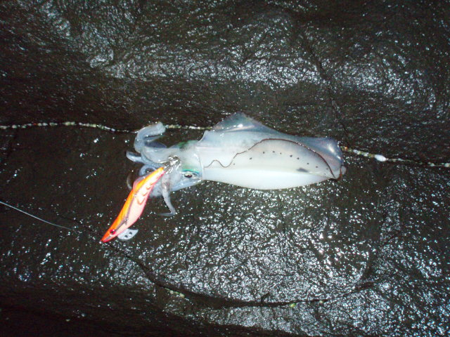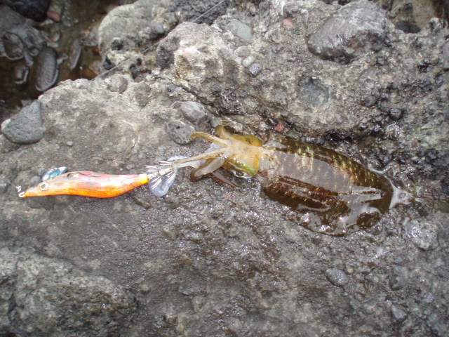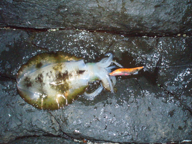 次のポイントに入れなかったらむりやなと思ったが、幸い誰もいなかった。1投目からエギについて来た。バシッと合わすが乗せ損ねて墨を吐いてにげていった。次は乗せた。胴長12cmまずまずのサイズ。