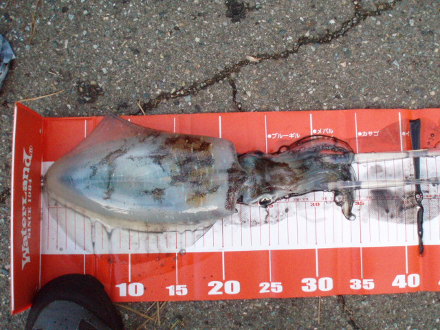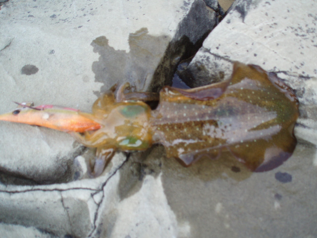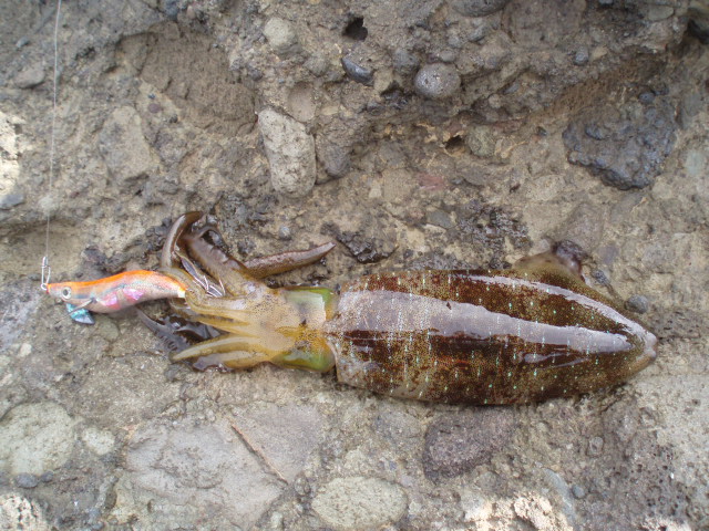 波ないやん。そやそや、イカでもやってみるか。エギ王Q2.5号をキャスト。1投目からスーとついて来た。エギを抱いた。パシッ乗った。おおーこれこれグィーングィーン。墨をバシューバシュー吐きながら上がってきた。そこそこサイズの胴長12cm