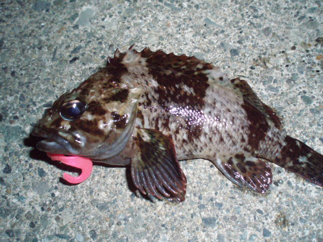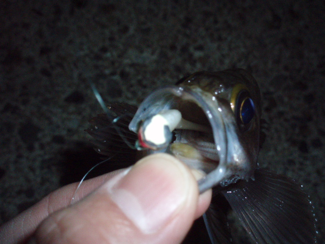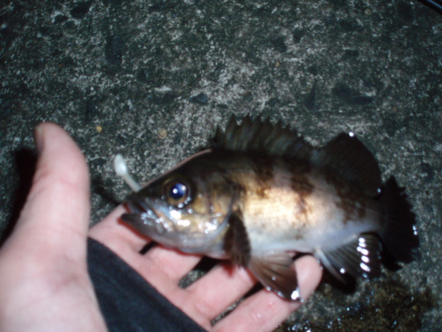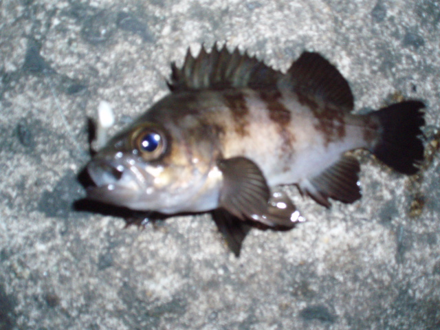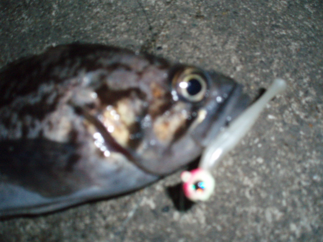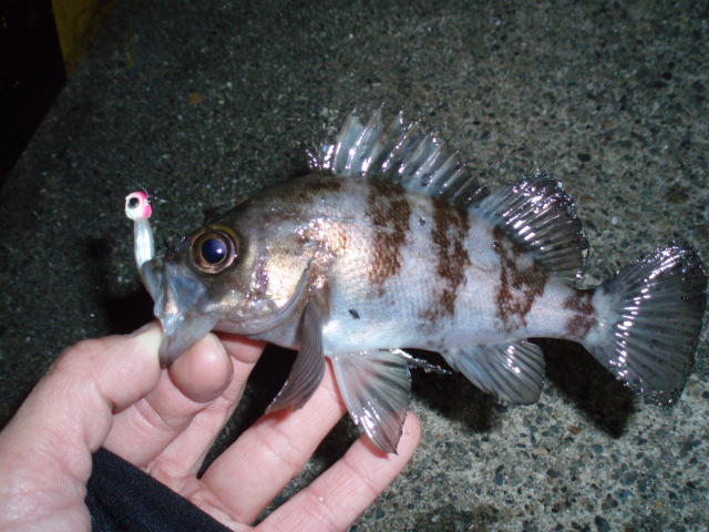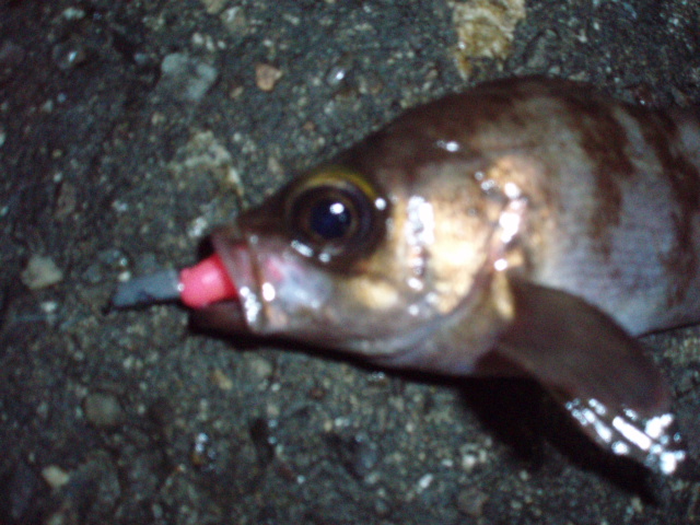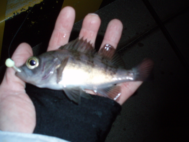 と歌いながら釣ってました。なかなかメバルがでません。今度は強い引きだったんで、来たか!と思いましたがおなかポテポテのガシラでした。