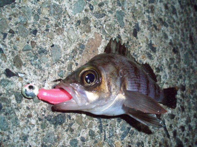 風はないが裏の公園で子供らが凧を走ってひっぱりまわしているのを見ながらどこ行こうかなと考えていた。まだ波もありそうなんで、近場ですることにした。明日から学校始まるからはよ寝なさいと子供らをふとんに入れそそくさと出撃。波はまだあり風も強い。2gジグヘッドに月下美人ビームフィッシュをセットしキャスト。コツ!当たったが乗らず。次でヒット!クククッと小気味よい引きであがってきたのは
