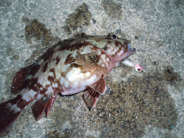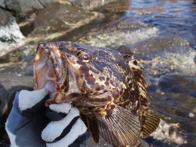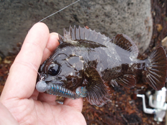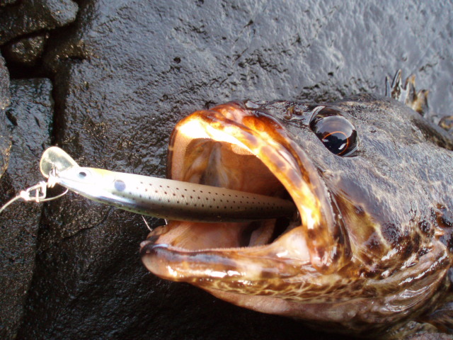 なわけありません。三陸海岸でよく釣れるベッコウゾイでした。ルアーがっぷり食ってます。