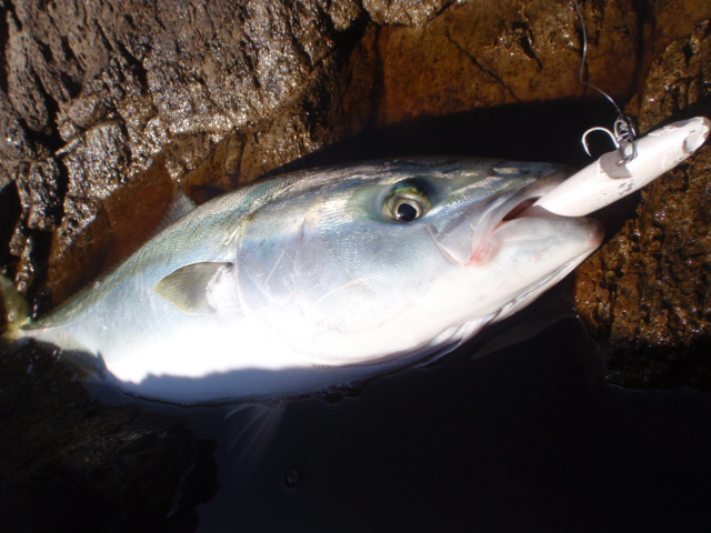 何度も狙うが反応がないので根回りから磯際にキャストしゆっくりとリトリーブすること3投目