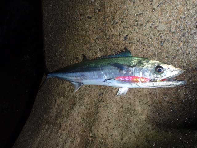 ダツがウロウロする季節なのでダツかなとルアーが足元まで来てから海面をライトで照らすとなんと正体はトビウオでした!