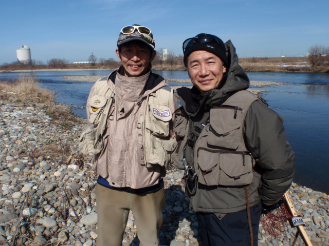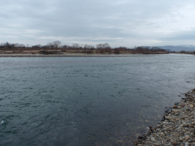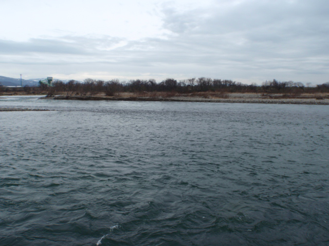 予報では春一番が吹くみたいなんで、南風をフォローに受ける左岸のポイントを選択。