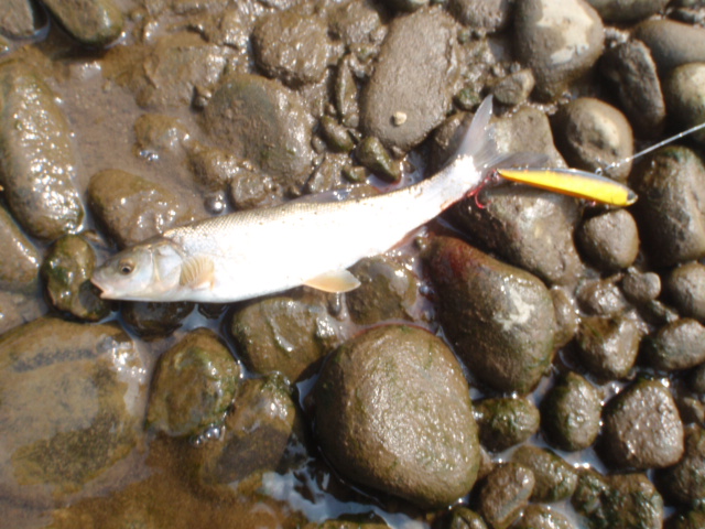 流れが緩やかなので、ダートアクションで誘うためクルーズシンキングミノー80でボトム付近をダートさせて誘うが反応なし。