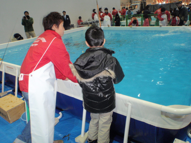 イベントホールで開催されるマス釣り体験の整理券をもらうために開場1時間20分待つことに