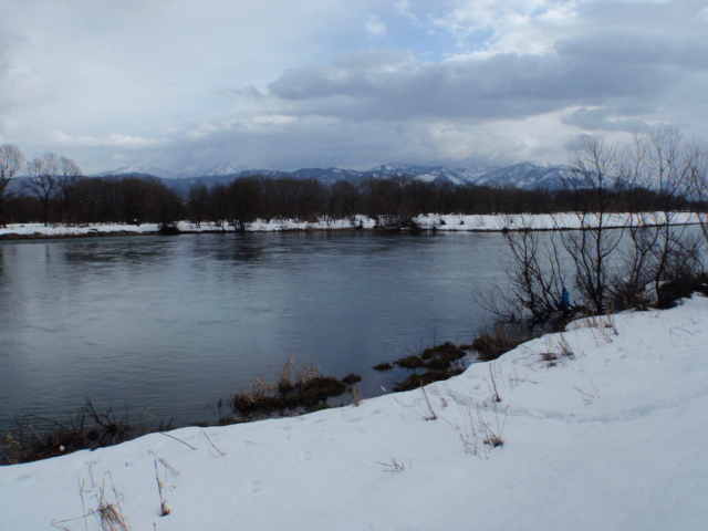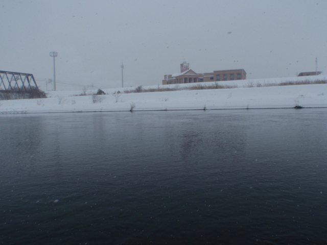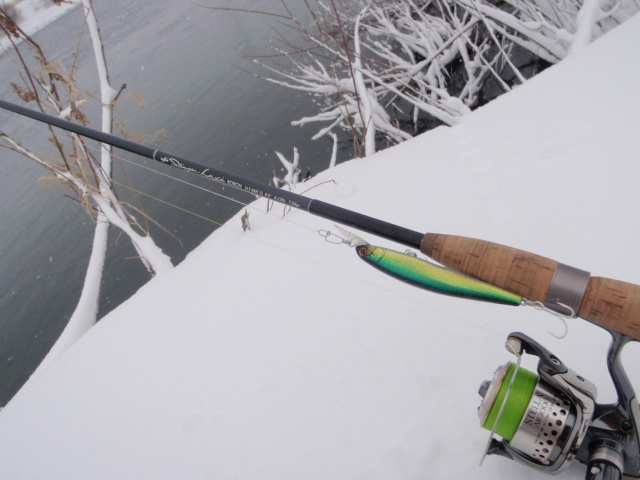 日が差したり吹雪になったりとややこしい天気の中、釣り下ったが反応ないのでここで終了。