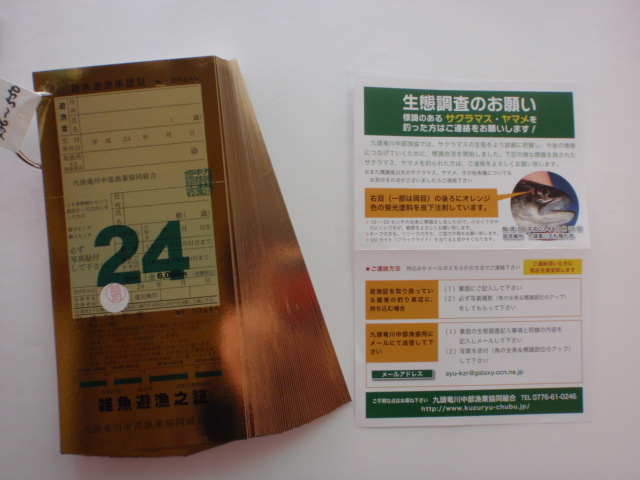 右にあるカードは、九頭竜川中部漁業協同組合さんのお願いで、サクラマス、ヤマメの生態調査の記入カードです。