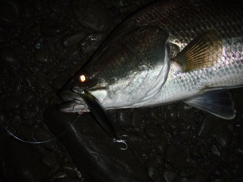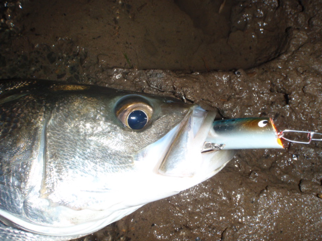 瀬の落ち込みで待ち構えているであろうシーバスに浅瀬からモーキン(ブラックオレベリ)を流す。