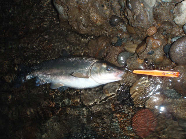 狙いをそこへ絞ることにし数投目、リトリーブ後ドリフトさせるとコン!と当たるが合わせずにそのままドリフトさせてやると、グンと持って行ったところで合わせた!